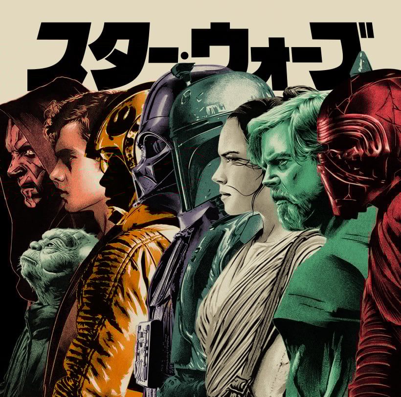Pack de las 9 láminas de la serie. 1 de cada uno de los personajes (Maul, Yoda, Anakin, Luke, Vader, Boba, Rey, Old Luke & Kylo) Formato A3 - 42 x 29,7 cm // 16,5 x 11,7 inches. Timbre en seco de autenticidad.